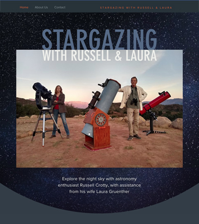 Artist and amateur astronomer Russell Crotty and I host public and private Stargazing Evenings, observing through our three portable telescopes. These night-sky observing sessions are complemented by discussions of basic astronomy, constellation locating, and all sorts of celestial phenomenon.